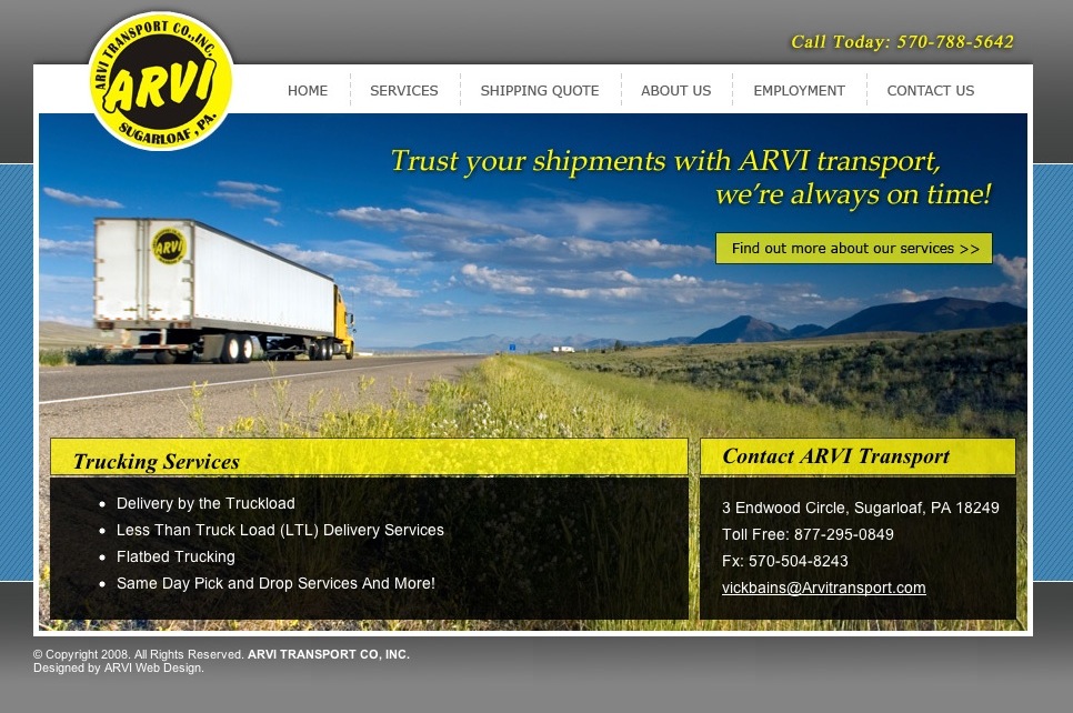 ARVI Transport Client ARVI Transport Services Design, Develop and build website with custom backend. Date Feb, 2009 Team Designers - Developers The complimenting gradients of blue, and grey on the background complement the yellow and white logo design.